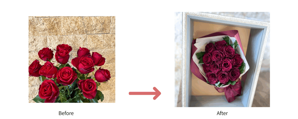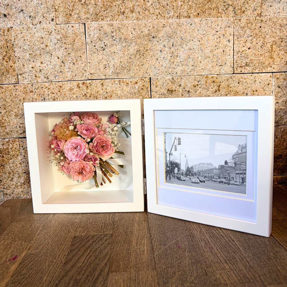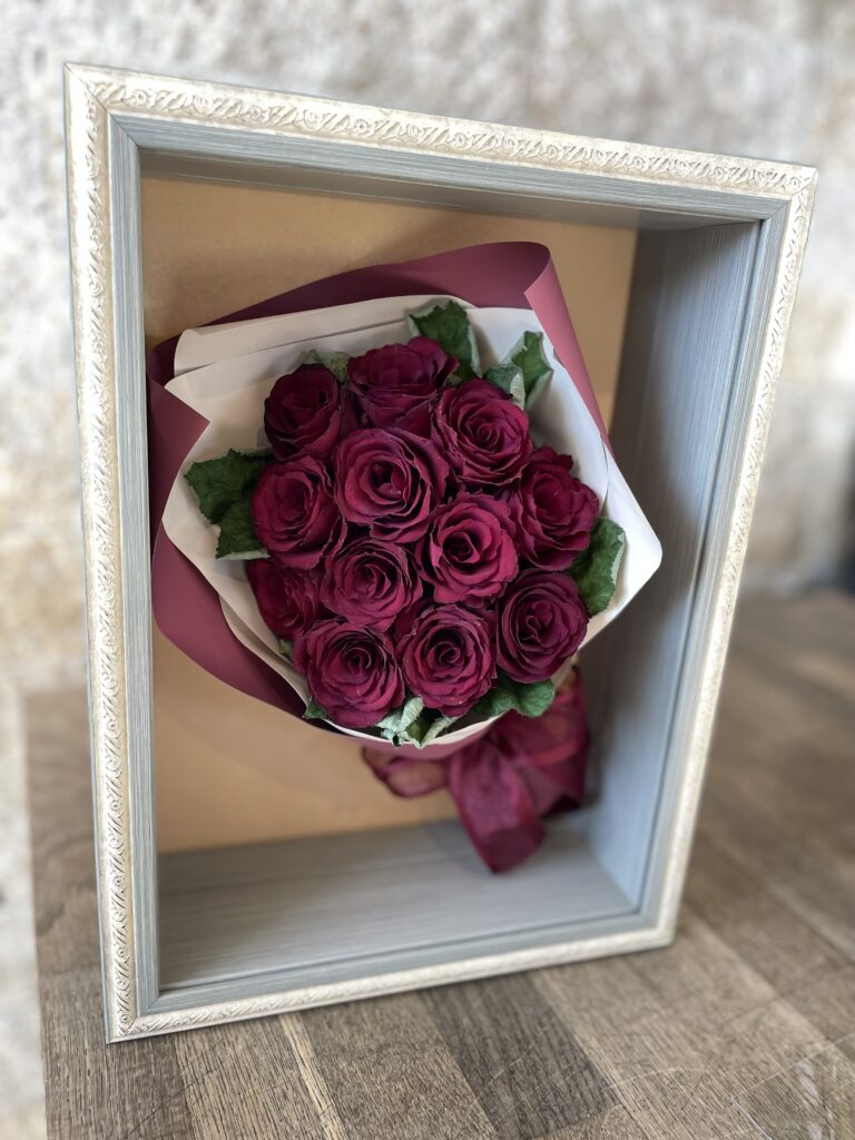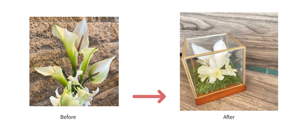 お客様からお預りしたお花は、特殊な方法で丁寧に乾燥させ、当店フローリストがを込めて加工致します。生花に精通した経験豊富なフローリストだからこそ、お花の種類や状態に合わせて最適な加工方法を選んで加工しております。加工後は湿気や埃から守るために、乾燥剤入りのフレームやガラスケースにデザインし、質の高いサービスをお手頃な価格でご提供しております。