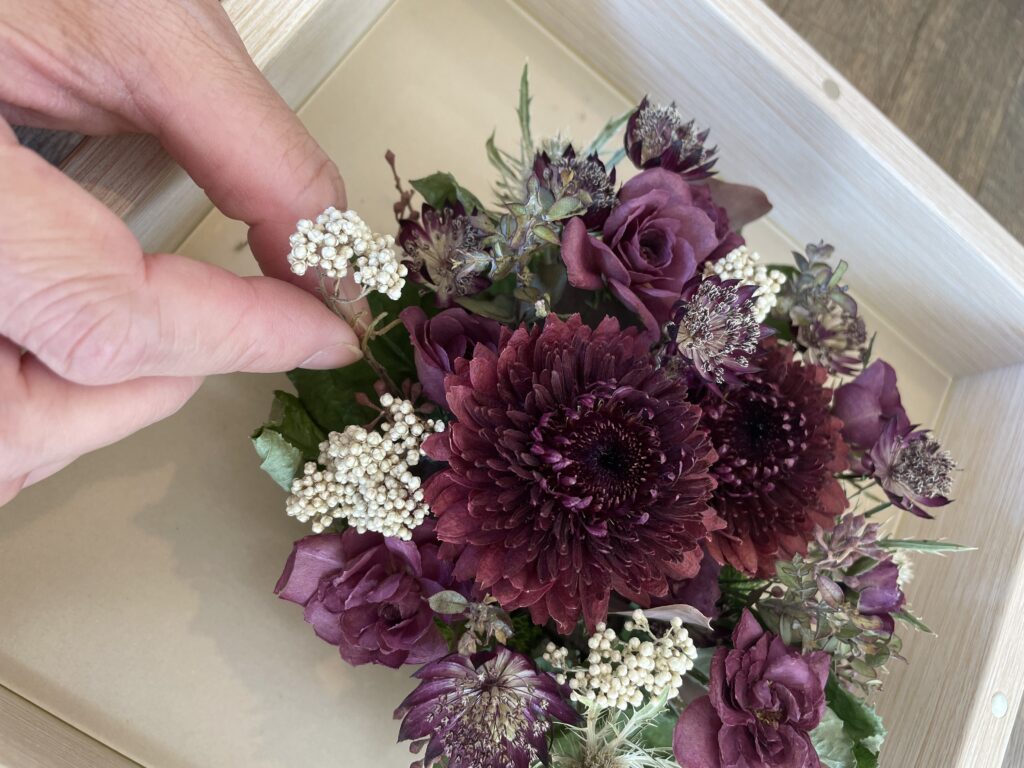 お花の加工がすべて終わったら、いよいよ最後の仕上げへ。お選びいただいたフレームや器に一輪一輪の表情を活かしながらアレンジしていきます。