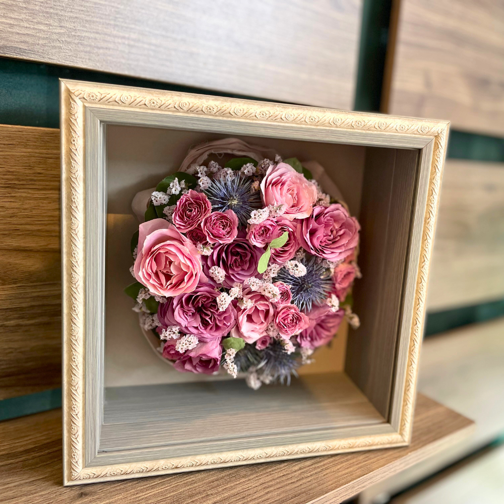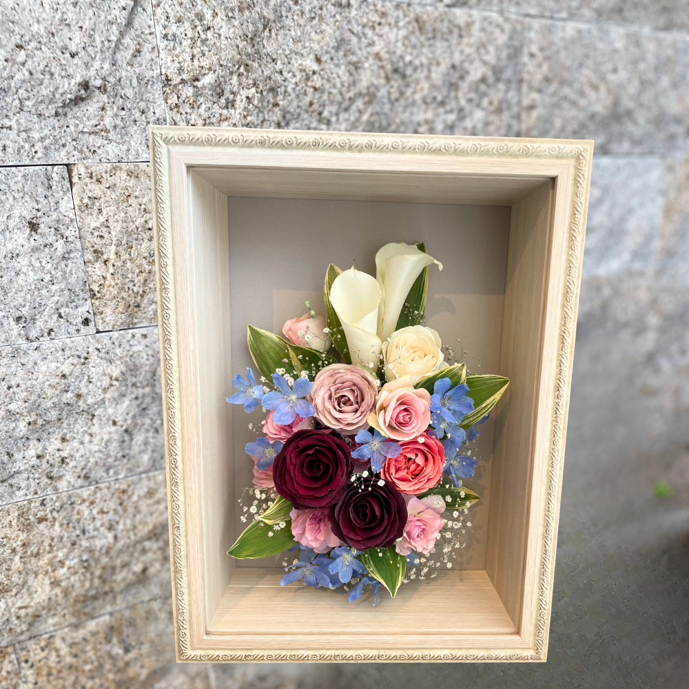 正方形のボックス型フレームです。クラシカルで華やかな額縁で、エレガントなお部屋におすすめです。ブーケ全体の花を丸いフォルムにまとめたり、隙間なく花を敷き詰めるデザインが可能です。